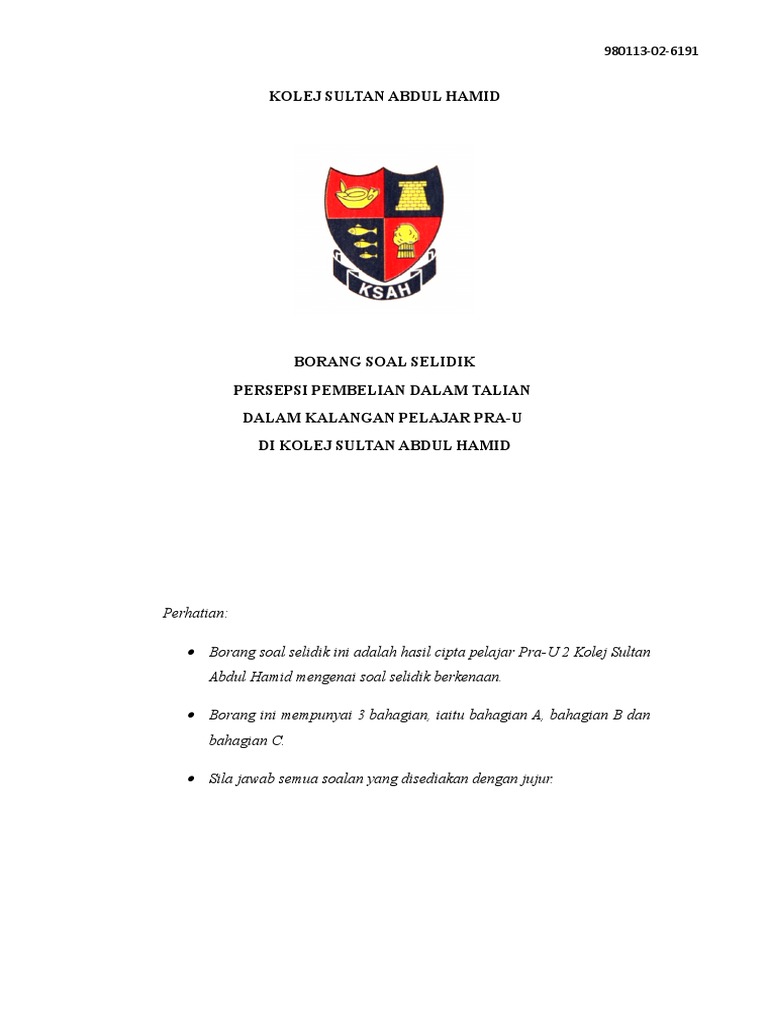 (2013 ),pbs pengajian am stpm 2013 penggal 2 [contoh untuk. Aug 20, 2017 · soalan borang soal selidik merupakan soalan tertutup dan menggunakan skala biasa berserta skala linkert. Falsafah boleh dibahagikan kepada empat cabang,iaitu metafizik,axiologi,epistemologi,dan logik. Dec 31, 2018 · menurut kamus dewan edisi keempat soal selidik ialah sejumlah soalan yang dikemukakan di dalam borang.